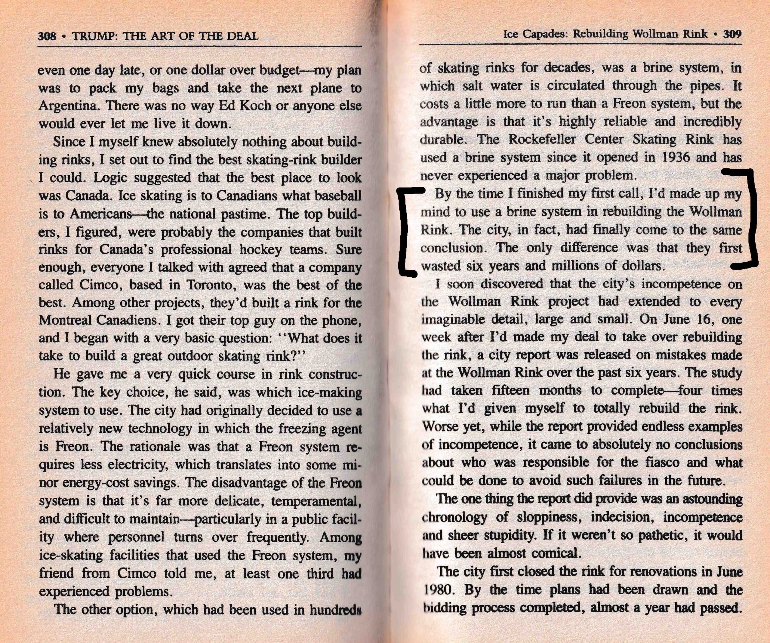 The biggest problem that needs to be solved for a data center is cooling, see Google AI overview above. But cooling efficiently is not a problem that is new, see Trump’s book below: